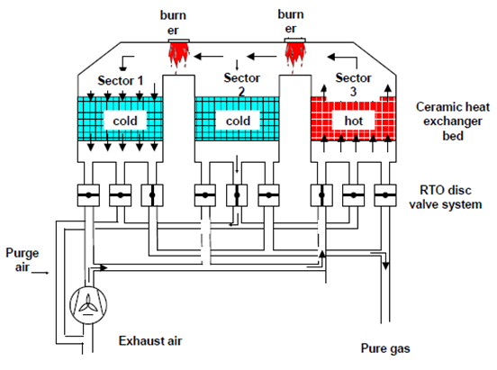 完成后,蓄热室的进气与出气阀门进行一次切换,蓄热室C进气,蓄热室B出气,蓄热室A吹扫;再下个循环则是蓄热室B进气,蓄热室A出气,蓄热室C吹扫,如此不断地交替进行。