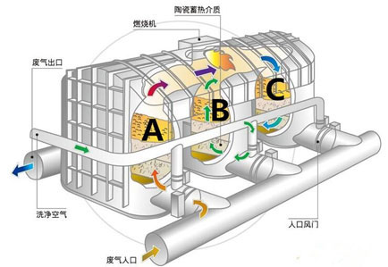 废气成为净化的高温气体后离开燃烧室,进入蓄热室C(上两个循环陶瓷介质已被冷却吹扫),释放热量,温度降低后排放,而蓄热室C的陶瓷吸热,贮存大量的热量(用于下个循环加热使用)。蓄热室B在这个循环中执行吹扫功能。